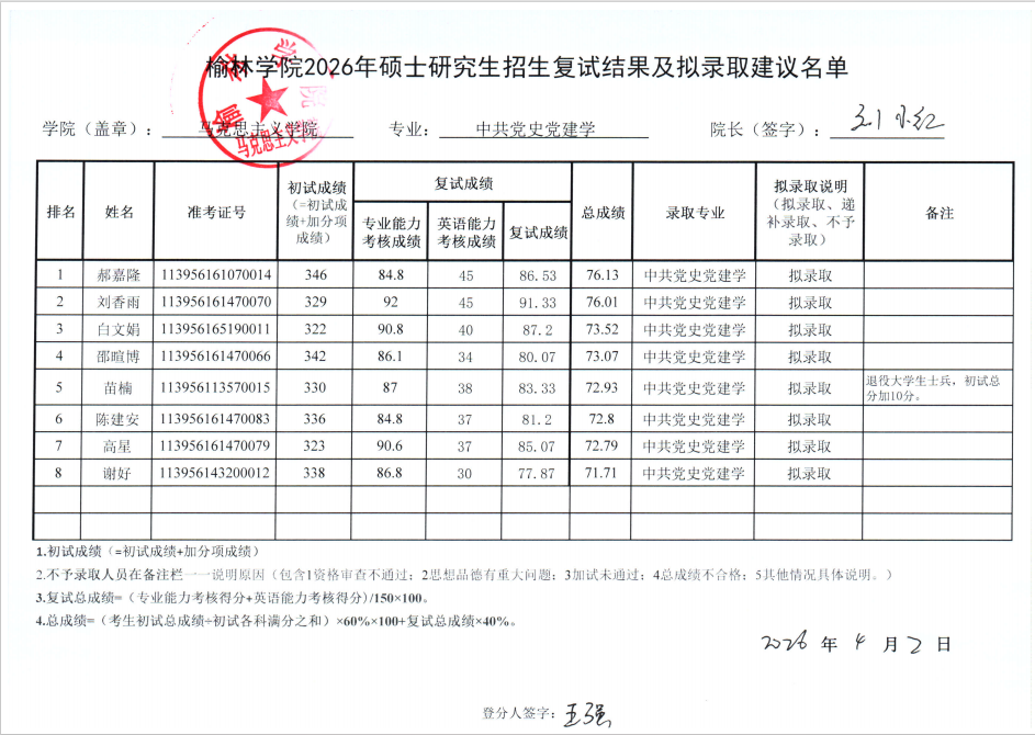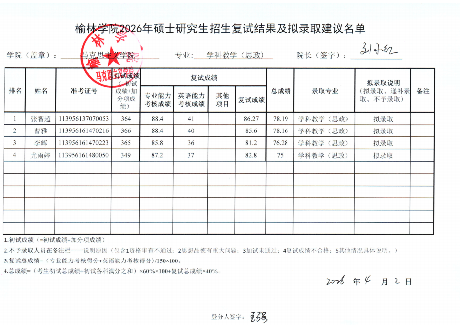 马克思主义学院2026年硕士研究生复试成绩及“拟录取建议”名单公示