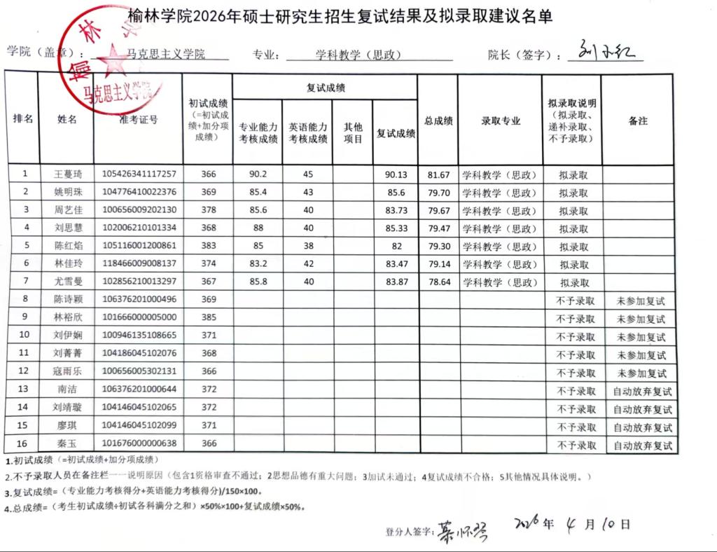 根据《榆林学院马克思主义学院2026年硕士研究生招生复试录取工作实施细则》,我院对调剂考生进行了复试。现将参加调剂复试考生结果予以公示: