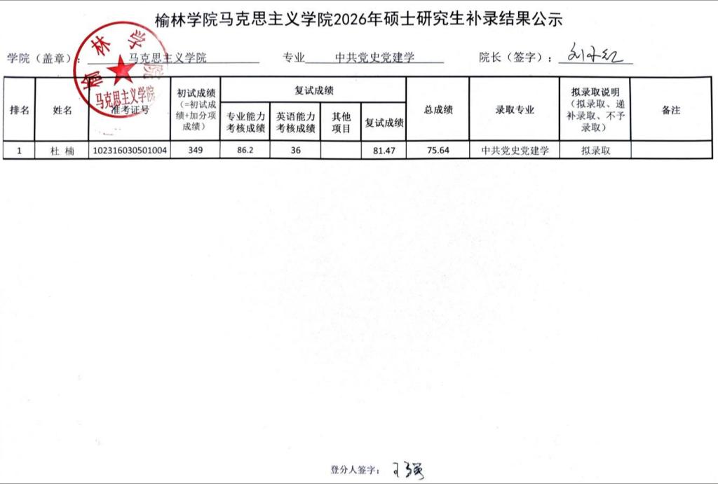 榆林大学马克思主义学院2026年硕士研究生补录结果公示