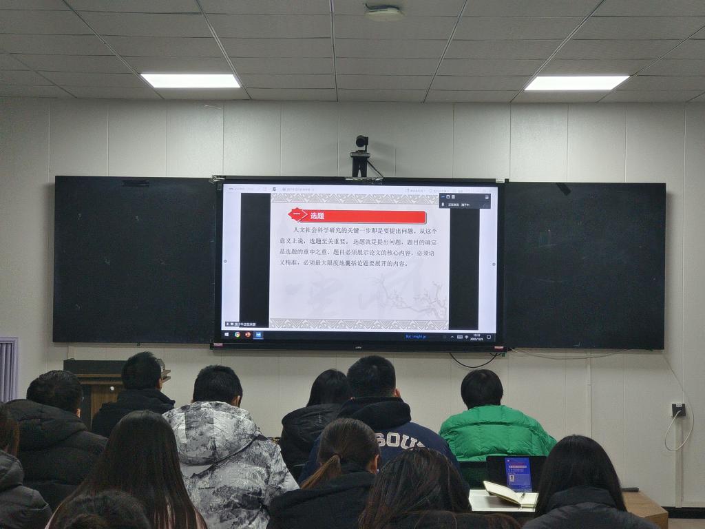 胡军良教授主要从论文选题、写作论证及相关规范三个板块展开讲解,详实而生动地为同学们讲解了从选题来源、如何拟题到如何展开论证、谋篇布局等关乎论文写作的核心内容。其一,胡军良教授强调人文社会科学研究的关键一步即提出问题,选题至关重要,结合多个示例为同学们讲述了题目如何做到语义精准、最大限度囊括论题以呈现文章核心内容;其二,胡军良教授指出积累基础的重要性,要研读经典文本以开拓学术视野、注重逻辑训练以增强学术论证、学习遣词用句以提升学术表达;其三,胡军良教授从论文整体结构的角度,对摘要、关键词、引文、正文、参考文献进行了分别阐述和讲解,强调同学们要立足勤奋,多积累、多动笔。