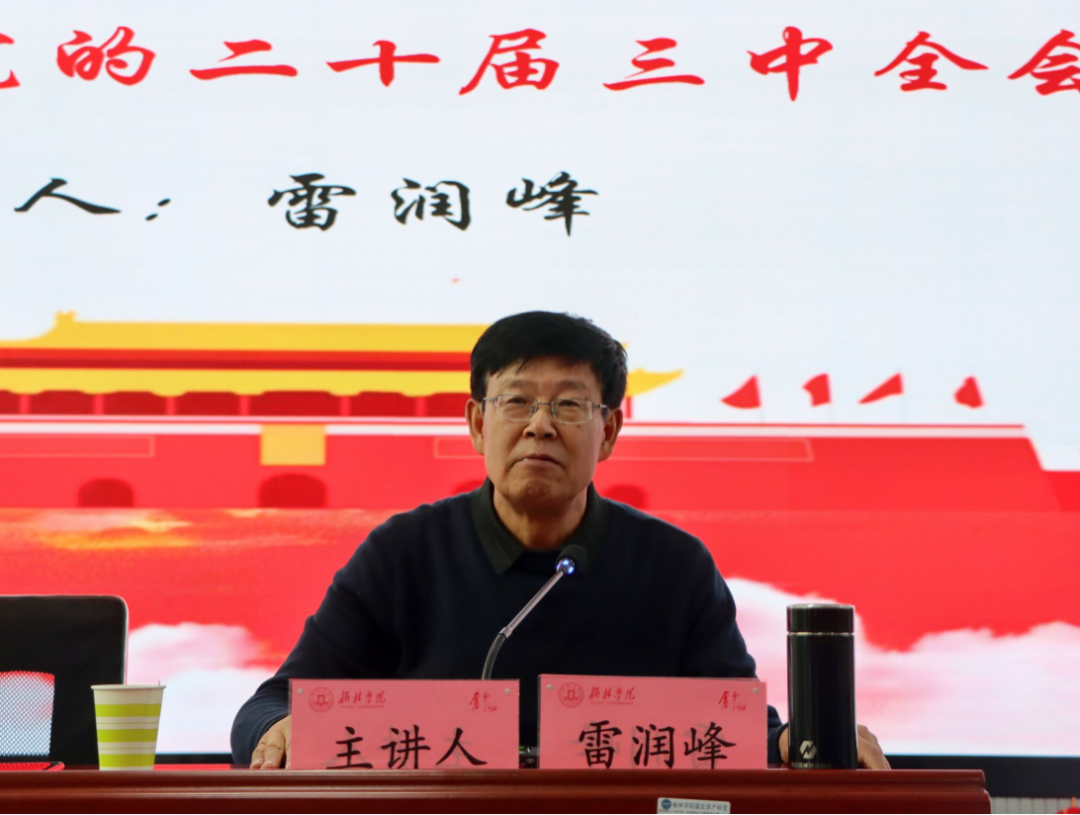2024年11月8日,马克思主义学院在子洲楼458教室举办党的二十届三中全会精神学习专题报告会。榆林学院客座教授、市委党校特聘专家,榆林学院校外辅导员雷润峰受邀为我院师生作了题为《学习改革精神,奋斗时代新人——党的二十届三中全会精神学习专题》的报告。报告会由马克思主义学院党总支书记主持,马院师生党员、2024级全体新生及青马学社全体社员参加。
