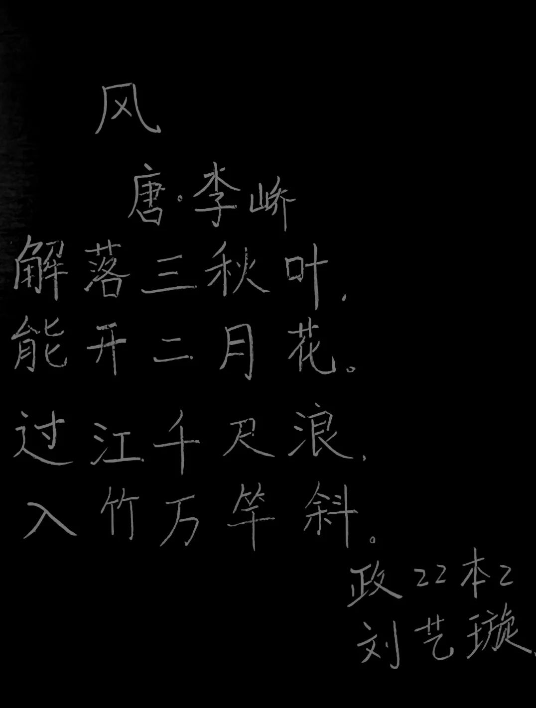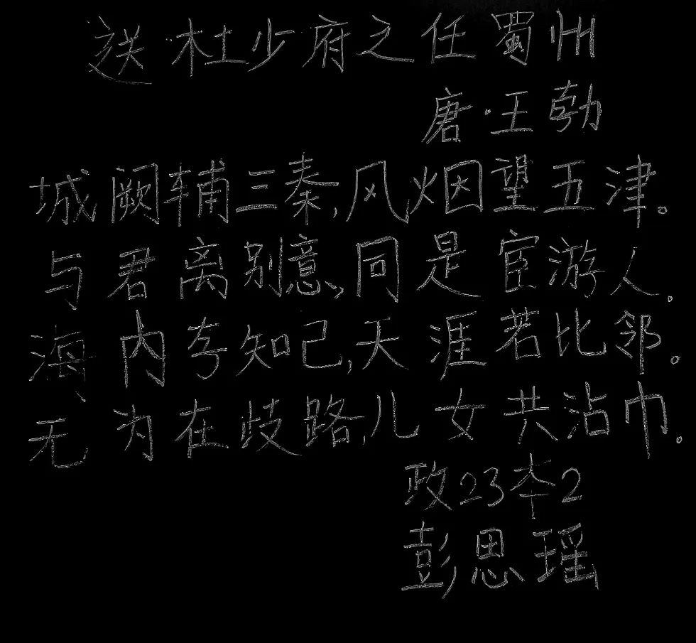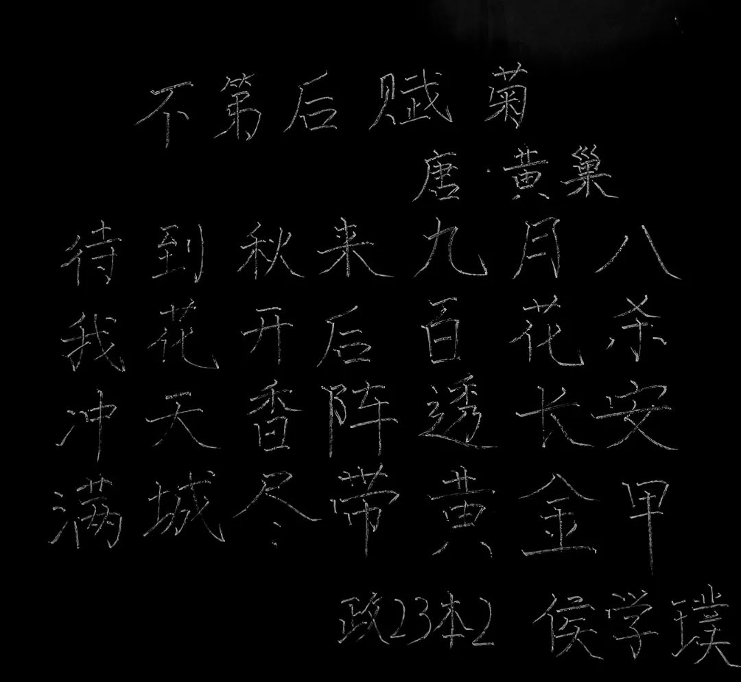 “粉笔无言传智慧,青丝染霜教有方”,板书是师生之间有效互动的桥梁。为提升师范生的教学基本功,展现其专业素养,我院于10月22日晚上在6405举办粉笔字书写大赛,有20位同学参加本次比赛。比赛采用现场黑板书写的形式,内容可自行选取中华经典诗词歌赋等文学作品。
