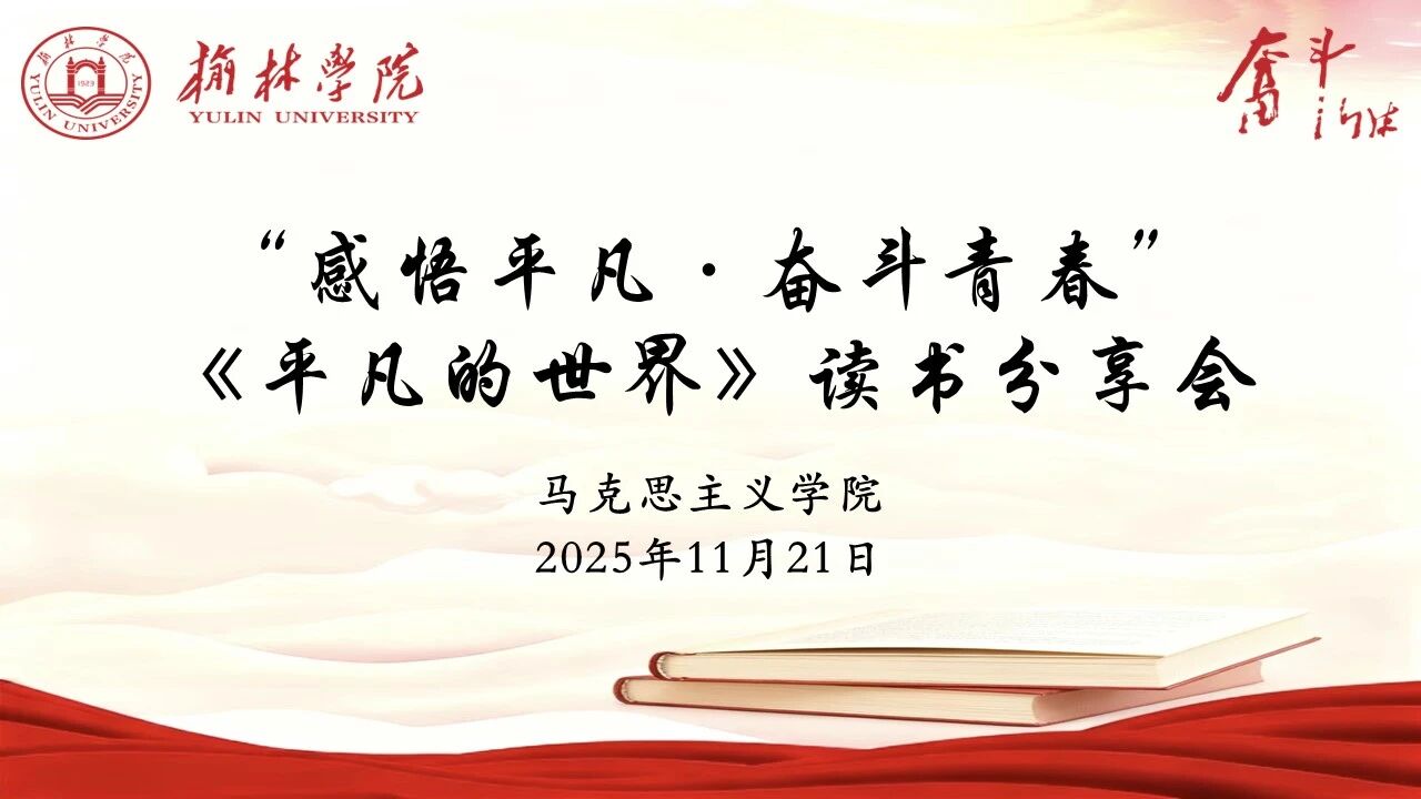 为积极响应"深化全民阅读活动"的号召,全面贯彻落实榆林学院"五乐"育人工程,引导广大学子深刻理解"平凡铸就伟大"的时代内涵,马克思主义学院于2025年11月21日14:30在子洲楼458实验室举办了以"感悟平凡·奋斗青春"为主题的《平凡的世界》读书分享会。本次活动以"乐读"为基础,以"乐讲"为载体,充分展现了同学们的阅读热情与表达风采。马克思主义学院党总支副书记张元春、团总支书记杨焱勋、科研秘书兼青马学社指导教师张杰、思想政治教育专业教研室主任马宇飞、经典读书社指导老师李悦出席活动。活动由雷荔媛同学主持。