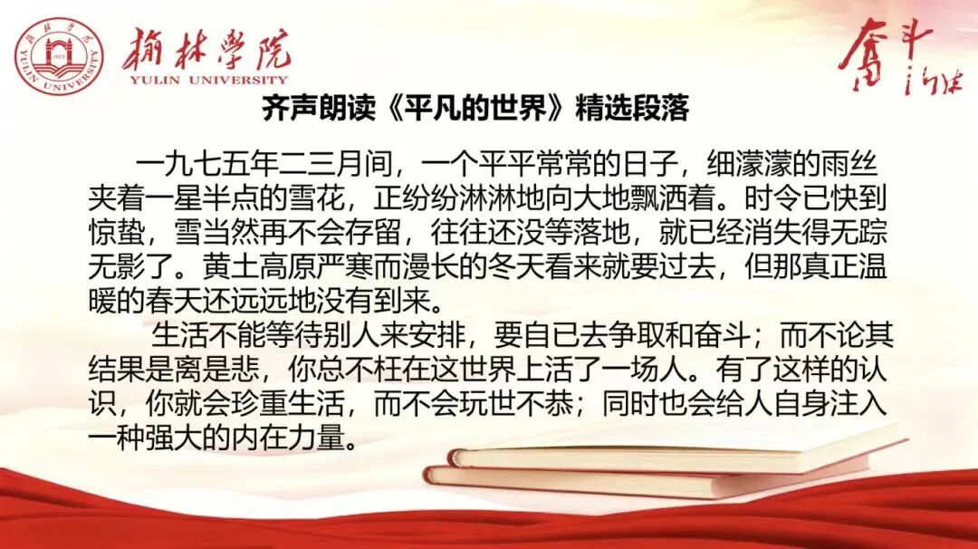 本次《平凡的世界》读书分享会,不仅是一场精彩纷呈的文学盛宴,更是一次意义深远的思想启迪。它激励着同学们将书中传递的坚韧意志与奋斗精神,真正的内化于心、外化于行,在今后的人生道路上坚定信念、勇担使命,努力成长为堪当民族复兴大任的新时代青年。