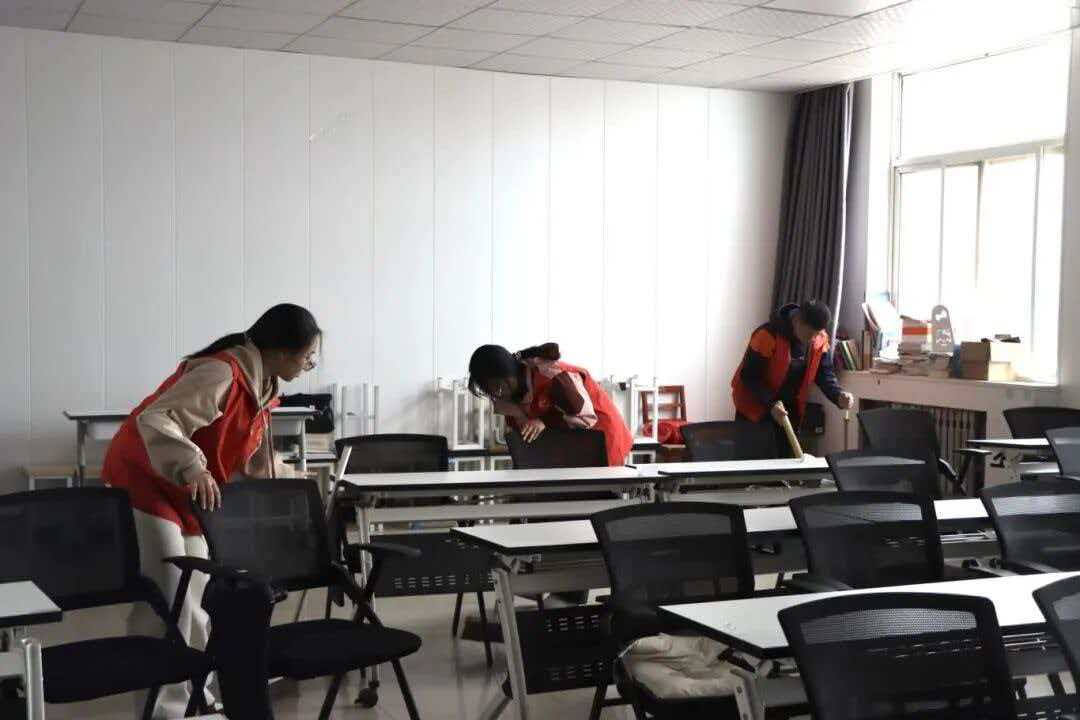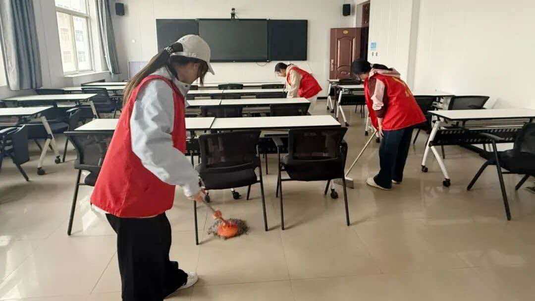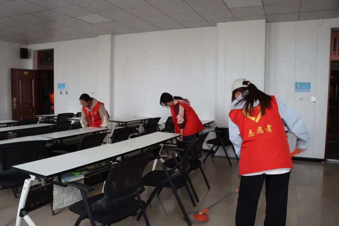 志愿者们在六号楼6405教室集合,本次志愿清扫活动于3月21日下午2点准时开始,所有志愿者统一着装、有序列队,在负责人统筹安排下明确分工、高效协作。大家秉持认真负责的态度,迅速投入到清洁工作中,对6405、6408教室、学生办公室及思政教研室等重点区域进行全面细致打扫。